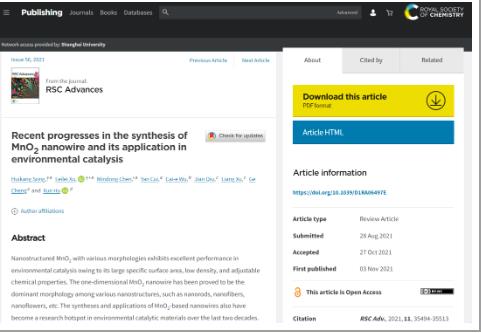 03介紹:2021年11月,南京信息工程大學(xué)、南京林業(yè)大學(xué)、濟(jì)南大學(xué)與江蘇雙良環(huán)境科技有限公司在《Royal Society of Chemistry》期刊上發(fā)表“Recent progresses in the synthesis of MnO2 nanowire and its application in environmental catalysis”一文。