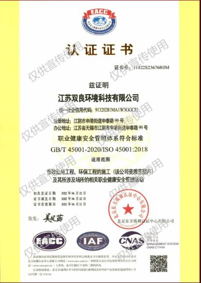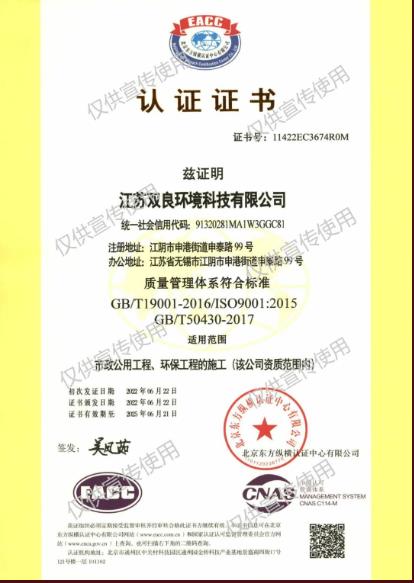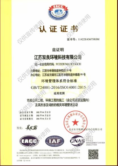 經(jīng)專業(yè)認證機構(gòu)嚴格審核,2022年6月,江蘇雙良環(huán)境科技有限公司成功獲得ISO9001:2015 質(zhì)量管理、ISO14001:2015 環(huán)境管理、 ISO45001:2018 職業(yè)健康安全管理三大體系認證。認證范圍覆蓋市政公用工程、環(huán)保工程的施工。