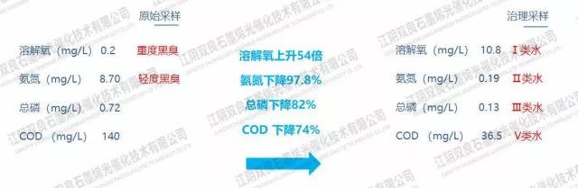 治理后已消除黑臭,并且水質(zhì)指標(biāo)已接近Ⅳ類水。gaP新型光催化網(wǎng)_水庫治理_河道治理_水生態(tài)修復(fù)_水環(huán)境治理與修復(fù)_江蘇雙良環(huán)境科技有限公司