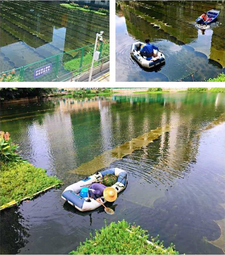項(xiàng)目施工前期通過(guò)截污工程,將生活排口接入市政管網(wǎng)。主體工程施工于2019年5月10日開始,通過(guò)敷設(shè)光催化網(wǎng)及其配套輔材生物填料,池岸四周放置植物浮島、浮床。lX2新型光催化網(wǎng)_水庫(kù)治理_河道治理_水生態(tài)修復(fù)_水環(huán)境治理與修復(fù)_江蘇雙良環(huán)境科技有限公司
