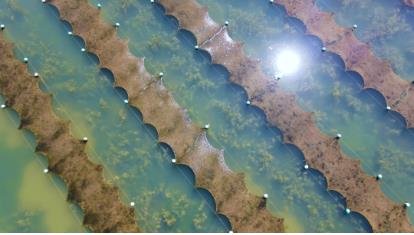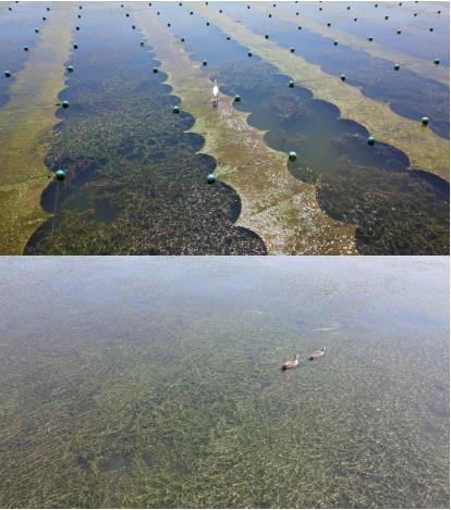 ▲治理區(qū)航拍下自然生長(zhǎng)的水下森林Dxk新型光催化網(wǎng)_水庫(kù)治理_河道治理_水生態(tài)修復(fù)_水環(huán)境治理與修復(fù)_江蘇雙良環(huán)境科技有限公司