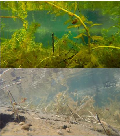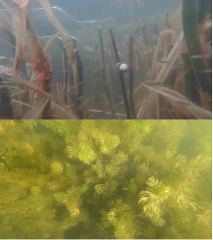 ▲治理區(qū)自然生長(zhǎng)的狐尾藻、蘿卜螺Dxk新型光催化網(wǎng)_水庫(kù)治理_河道治理_水生態(tài)修復(fù)_水環(huán)境治理與修復(fù)_江蘇雙良環(huán)境科技有限公司