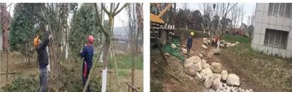 近期,成都項目部主要對變更的園區(qū)北側(cè)廣場、水系景觀改造以及園區(qū)常規(guī)養(yǎng)護(hù)等展開了工作。其中北側(cè)廣場的施工于2月11號正月初七就已開始。年后,道路澆筑、路面鋪裝、土方開挖回填、喬木灌木栽植、水電安裝等分項工程井然有序地進(jìn)行,時至今日,該區(qū)域施工內(nèi)容已完成80%。