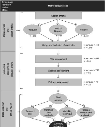 (3)建模技術(shù):提取每個(gè)研究案例的建模技術(shù)的數(shù)量和類型,并將其分類為PB模型或DD模型。確定了每個(gè)建模方法中最經(jīng)常出現(xiàn)的變量,以及用于優(yōu)化輸入變量或確定主要預(yù)測(cè)因素的統(tǒng)計(jì)程序。此外,盡可能提取和量化用于評(píng)估模型性能的指標(biāo);