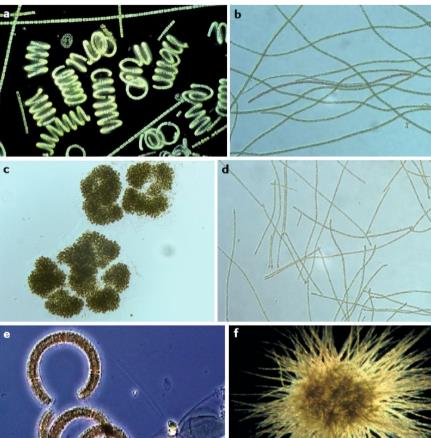 藍藻可形成致密的水華(圖1)。藍藻水華指主要由藍藻引起的水體顏色的明顯改變。常見導(dǎo)致水華形成的屬有絲囊藻、胞藻、長胞藻、微囊藻、節(jié)球藻、浮絲藻和束毛藻(圖2)。藍藻水華會導(dǎo)致嚴重的水質(zhì)問題,它們增大水的濁度從而導(dǎo)致水下植物窒息,微生物降解衰老死亡的水華消耗大量氧氣,導(dǎo)致魚類和底棲無脊椎動物因缺氧而死亡。藍藻會產(chǎn)生帶有異味的氣體混合物,干擾湖泊的娛樂功能和水庫儲蓄飲用水的功能。此外,藍藻水華還可以產(chǎn)生多種藻毒素,當被鳥類、哺乳動物和人類攝入時會引起肝臟、消化和神經(jīng)系統(tǒng)的疾病。