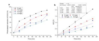 圖3 雜化體系中鉻(Ⅵ)初始濃度對(duì)(a)光催化還原和(b)動(dòng)力學(xué)線性擬合曲線的影響r1K新型光催化網(wǎng)_水庫(kù)治理_河道治理_水生態(tài)修復(fù)_水環(huán)境治理與修復(fù)_江蘇雙良環(huán)境科技有限公司