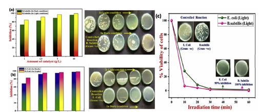 r1K新型光催化網(wǎng)_水庫(kù)治理_河道治理_水生態(tài)修復(fù)_水環(huán)境治理與修復(fù)_江蘇雙良環(huán)境科技有限公司圖1 不同光催化劑劑量對(duì)革蘭氏陽(yáng)性菌—枯草芽孢桿菌(B. Subtilis)(a)和革蘭氏陰性菌—大腸桿菌(E. coli)(b)活性的抑制作用;光照催化時(shí)間對(duì)細(xì)胞活性的影響(c)。
