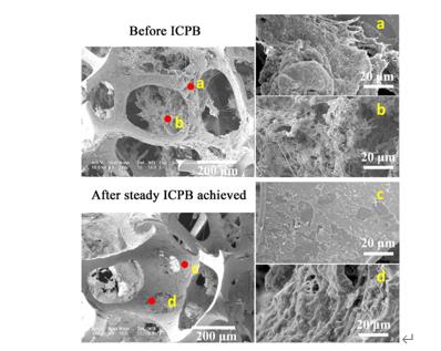 r1K新型光催化網(wǎng)_水庫(kù)治理_河道治理_水生態(tài)修復(fù)_水環(huán)境治理與修復(fù)_江蘇雙良環(huán)境科技有限公司圖1 ICPB前和ICPB穩(wěn)定階段海綿載體的SEM圖像。(a)和(c)分別為ICPB前和ICPB穩(wěn)定階段的外部圖像,(b)和(d)分別為ICPB前和ICPB穩(wěn)定階段的內(nèi)孔圖像