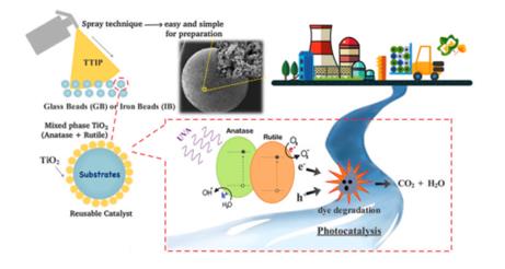 2)因其成本低、用途廣而被廣泛用作催化劑。然而,使用二氧化鈦粉末會導致很難從處理過的廢水中分離。因此,本課題研究了二氧化鈦在玻璃和鐵珠等兩種不同基質(zhì)上的固定化。采用噴霧液相法制備復合材料分散到基材上,然后材料在不同的溫度(600-750?C)煅燒。在700?C煅燒溫度下,SEM和EDS分析表明,TiO