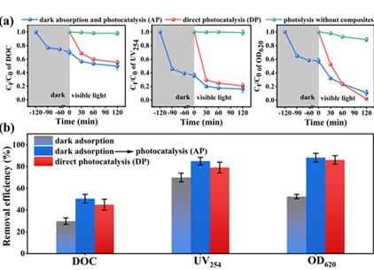 cTa新型光催化網(wǎng)_水庫治理_河道治理_水生態(tài)修復(fù)_水環(huán)境治理與修復(fù)_江蘇雙良環(huán)境科技有限公司(a) IOM在黑暗中的吸附和可見光下UV254和OD620光催化對(duì)DOC去除。黑線表示暗吸收和光催化(AP)。紅線表示直接光催化(DP),藍(lán)線表示不含復(fù)合物的光解結(jié)果已添加。(b)處理結(jié)束時(shí)的總體去除效率。(對(duì)于本圖例中的顏色參考,讀者可參考本文的web版本。)光催化是一種高效的高級(jí)氧化工藝,為控制湖泊或水庫中的藻華污染治理提供了一種很有前景的替代方法。以往的研究主要集中在光催化作用破壞藻類細(xì)胞上,而忽略了分泌物的釋放特別是細(xì)胞內(nèi)的有機(jī)物(IOM)。在此,通過固定相預(yù)光催化與新型Bi